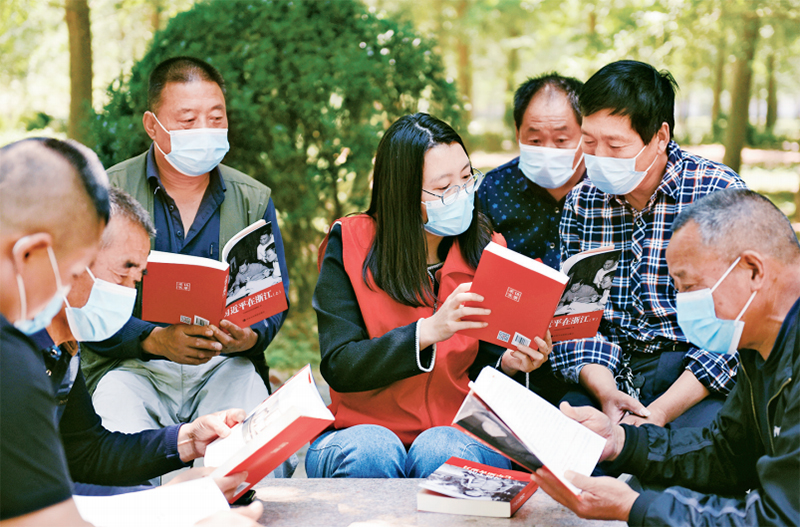 2022年5月16日,山东省临沂市郯城县“学理论宣讲团”成员走进马头镇民主街“农家花园”,开展“讲故事,学理论”宣讲活动。 求是图片 房德华/摄