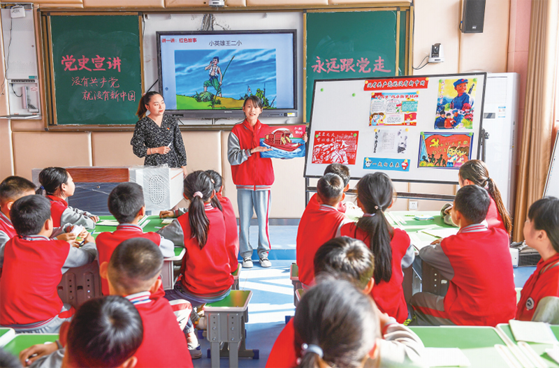江西省宜春市宜丰县各中小学校常态化开展党史教育进校园主题活动。图为2022年3月15日,宜丰县桥西中心小学的学生在思政课上分享自己的党史学习感悟。 人民图片 周亮/摄