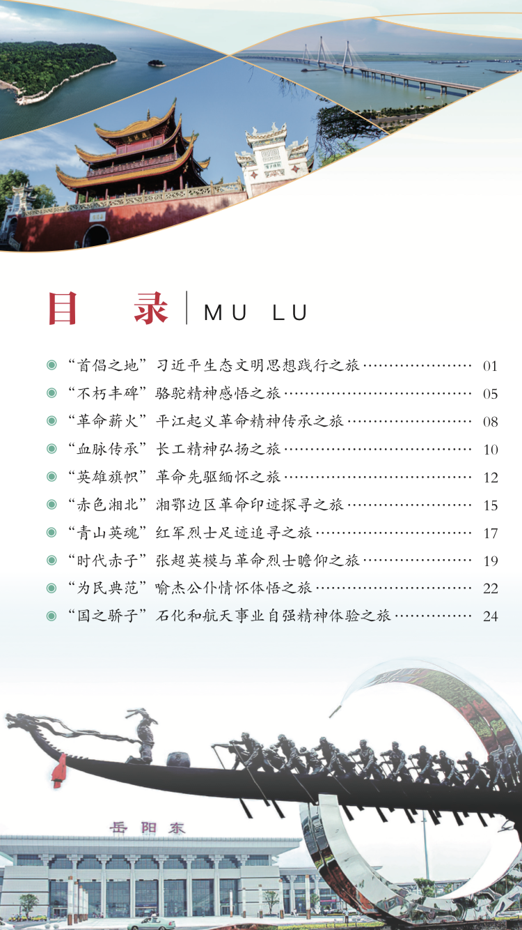 “走红岳阳”十大红色教育精品线路包括:“首倡之地”习近平生态文明思想践行之旅、“不朽丰碑”骆驼精神感悟之旅、“革命薪火”平江起义革命精神传承之旅、“血脉传承”长工精神弘扬之旅、“英雄旗帜”革命先驱缅怀之旅、“赤色湘北”湘鄂边区革命印迹探寻之旅、“青山英魂”红军烈士足迹追寻之旅、“时代赤子”张超英模与革命烈士瞻仰之旅、“为民典范”喻杰公仆情怀体悟之旅、“国之骄子”石化和航天事业自强精神体验之旅。