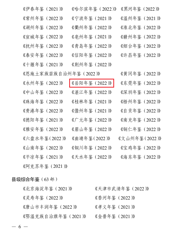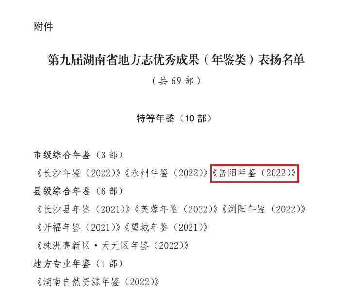 近日,中国地方志工作办公室、中国地方志学会组织开展第九届全国地方志优秀成果(年鉴类)评审工作,经各级评审、复审和终审,《岳阳年鉴(2022)》被中国地方志工作办公室评为全国一等年鉴,同时被湖南省地方志编纂院评为全省特等年鉴。这是《岳阳年鉴》创刊26年来首次获此殊荣,标志着岳阳创建一流年鉴实现新突破。