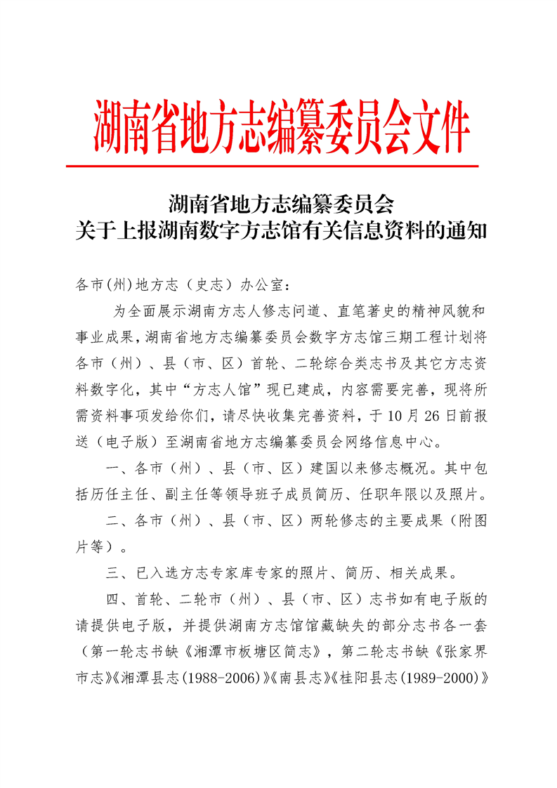 湖南省地方志编纂委员会关于上报湖南数字方志馆有关信息资料的通知