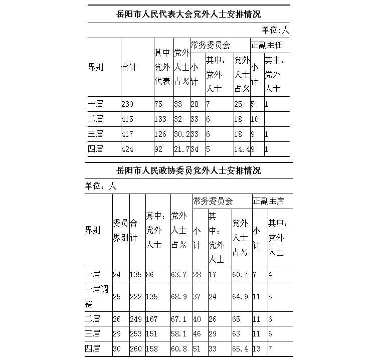 中共十一届三中全会后,中共地(市)委贯彻落实统战政策,不断加大党外人士安排工作力度。1982年,选拔优秀党外知识分子进入领导岗位,安排担任地直机关、县和农场处级领导职务的5人,任科级职务的62人。1984年5月,岳阳市人大、市政协起届,安排党外副主任1人,党外副主席4人;1985年3月,全市已安排党外领导干部137人,其中师级5 人,处级5人,科级127人。1986年5月,处级党外领导干部增至40人。1982—1987年落实统战政策期问,还安排省参事室参事8人,省文史馆馆员2人。