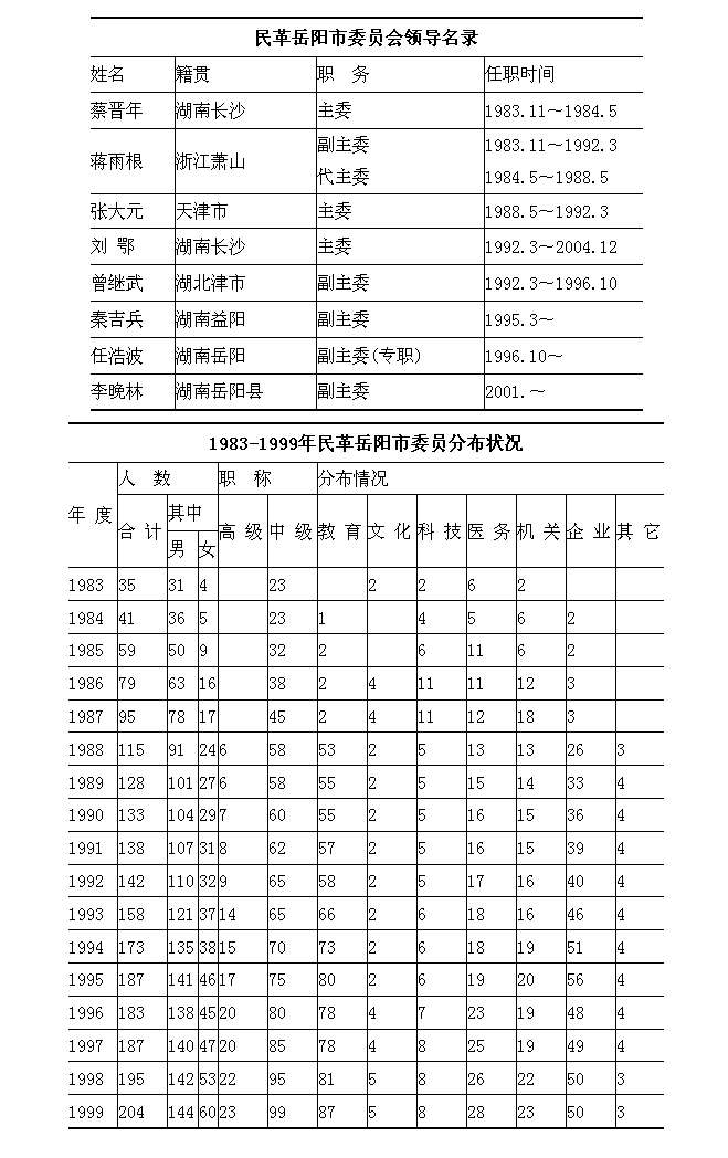 1983~1999年,民革市委设人秘处(后为办公室)、宣传处、组织处、经社处(后为联络处)。1983年,民革市委下设4个支部,党员35人;1999年下设17个支部,党员204人。