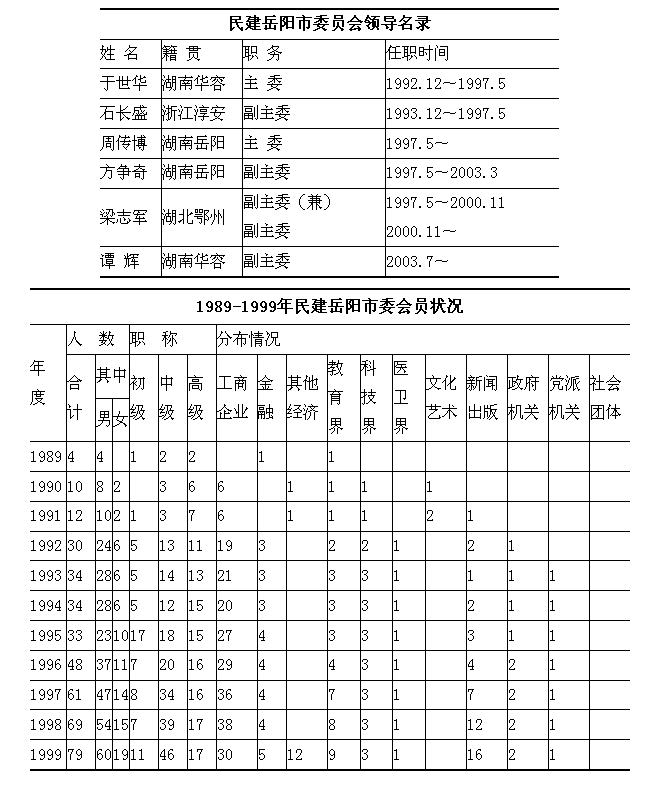 民建市委成立后,下设办公室、妇女工作委员会。至1999年底,由1992年成立的5个支部,发展到下辖7个支部,1个小组,会员79人。