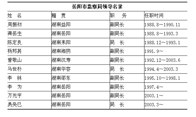 1988年2月,岳阳市及所辖各县、区相继成立监察局。其主要职能是负责检查监督政府各行政部门及其工作人员和企、事业单位中由国家行政机关任命的领导干部,贯彻实施国家政策、法律、法规情况;监督处理监察对象违反国家政策、法律和法规以及违反政纪的行为;受理个人或单位对监察对象违反国家政策、法律和法规以及违反政纪行为的检举或控告;受理监察对象不服行政纪律处分的申诉;审议经政府任命人员的纪律处分事项。年底,市监察局共有干部职工23人,内设办公室、综合调研室、监察一科、监察二科、审理科、信访科、政策法规科等7个科室。县(市)、区监察局各配备干部职工12—14人,全市有行政监察干部103人,工勤人员11人。