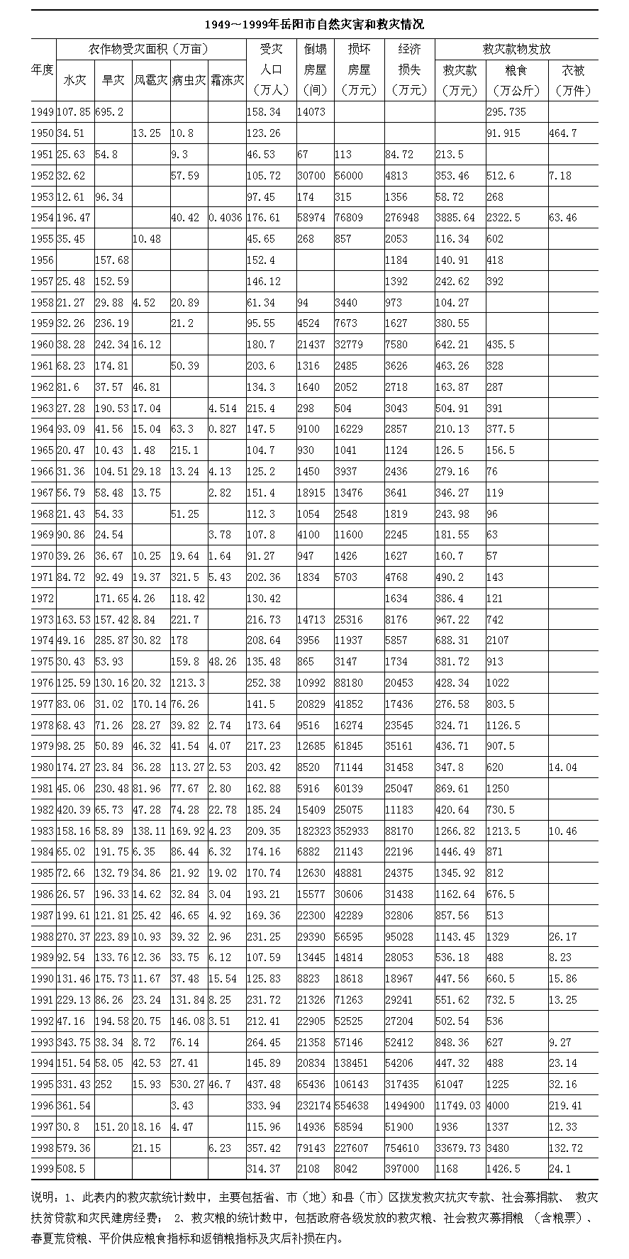 1949年夏秋时节,华容、岳阳、临湘、湘阴县发生水灾,先后淹田107.85万亩,倒塌房屋14073间,受灾人口达158.34万人。新生的各县政府 先后拨发救济粮591.47万市斤,发放农业生产贷粮和夏荒贷粮295.735万公斤。组织灾区群众以工代赈、生产自救收入折合成稻谷737.66万公 斤。1954年,滨湖地区遭受特大洪涝灾害,湘阴、华容、岳阳、临湘县溃垸187个,冲毁堤防设施426公里,被淹农作物175.21万亩,冲毁房屋 44921间,损坏房屋56674间,淹死8068人,死亡牲畜81873头,受灾人口162.94万人,其中38.46万人无家可归,造成直接经济损失 276142万元。各级政府安排车、船紧急抢救转移灾民,各机关、学校、厂矿腾出校舍、礼堂、办公室安置灾民住宿。省政府和湘潭、常德专区共下拨救灾款 3832.14万元,救灾粮3865万市斤,发放衣被63.46万件。5月3日~7月26日,平江县前后8次遭受山洪灾害。全县256个乡受灾,被淹农作 物21.26万亩,冲毁房屋14053间,损坏房屋20135间,冲坏塘堰5643座,冲毁桥梁1021处,受灾人口13.67万人。造成直接经济损失 805.74万元。全县发放救灾款53.5万元,救灾粮390万公斤。