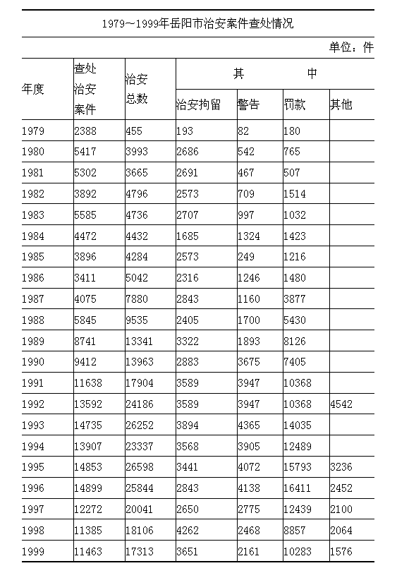 1986年9月5日,新的《中华人民共和国治安管理处罚条例》颁布,并规定从1987年1月1日起执行。十多年来,岳阳市公安机关认真组织干警学习,进行业务培训,同时将《条例》翻印成册,向广大人民群众进行普及教育。在工作中,各级公安机关坚持教育与处罚相结合的原则,严格按照《条例》的规定查处违反治安管理案件,维护社会治安秩序。