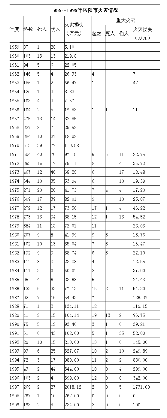 1999年6月28日~7月8日,岳阳市政府督查办、市建委、市消防支队组成2个督查组,对六县(市)三区政府贯彻实施《消防法》和《湖南省“九五”消防发展纲要》的情况进行督查,共发现重、特大火灾隐患25处,下发督查意见书9份,提出督查意见28条。