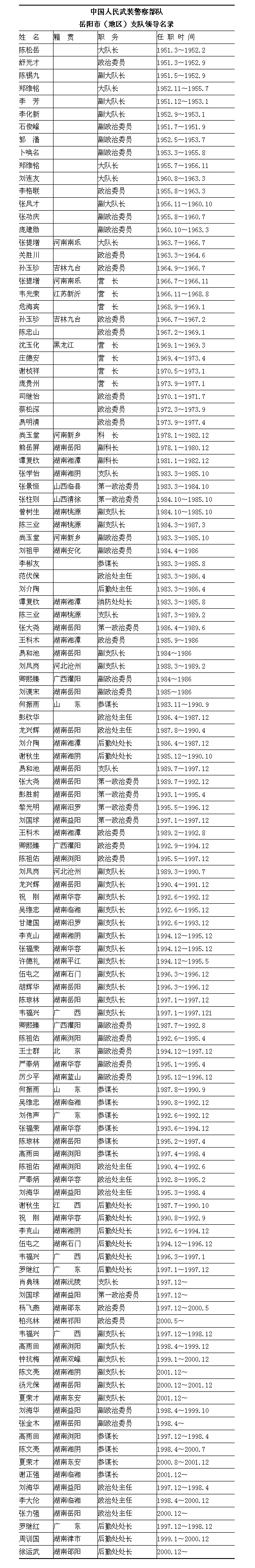 1952年9月长沙专区公安大队改为湘潭专区公 安大队,岳阳、临湘、平江、湘阴四县公安队由其管理,华容县公安队仍属常德专区公安大队领导。1964年9月,组建岳阳专区公安大队,原湘潭专区公安大队 所属第三中队,岳阳、临湘、平江、湘阴和益阳专区公安大队所属的华容县公安中队拨归岳阳专区公安大队建制领导。1966年3月,汨罗县公安队组建,归岳阳 专区公安大队建制领导。1966年,岳阳专署公安大队改编为岳阳军分区独立营。番号称中国人民解放军湖南省岳阳军分区独立营,归岳阳军分区建制领导,公安 大队的直属中队并入独立营。岳阳、临湘、平江、湘阴、华容、汨罗六县公安队均改编为县中队,番号为中国人民解放军湖南省××县中队,由所在县人民武装部建 制领导。1975年,6个县中队交岳阳地区公安局建制领导。同年5月10日,岳阳市武装民警中队成立,10月26日,岳阳地区公安局民警集训队成立。1980年10月18日,岳阳地区公安局民警科改为岳阳地区公安处武装民警科,管辖1市6县武装民警中队和1个民警集训队。1981年10月12日,组建岳阳地区行署公安处人民武装警察直属中队。同年12月9日,撤销岳阳县人民武装警察直属中队。岳阳行署公安处民警科管辖1市5县武装警察中队和1个直属中队、1个集训队。1982年,岳阳行署公安处武装民警科撤销,成立中国人民武装警察部队岳阳地区支队。1983年10月4日,中国人民武装警察部队岳阳市支队成立,下辖1个直属大队、2个消防中队、1个直属中队及1个县中队(岳阳县1983年11月30日恢复)。中国人民武装警察部队岳阳地区支队辖华容、湘阴、汨罗、平江、临湘5县武装中队、消防队。