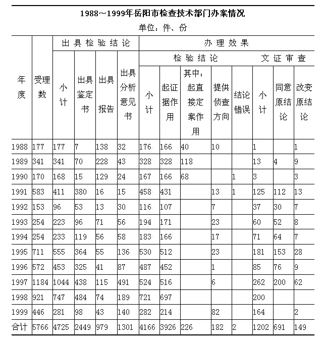1999年,全市检察技术部门共办结各类技术案 件446件。在办结案件中,法医检验鉴定211件,其中复核鉴定30件,物证照像、录像114件,现场勘验6件,文证审查102件,文检鉴定7件,司法会 计6件。在所办案件中共出具各类检验文书324件,起证据作用有214件,提供侦查方向的有82件,改变原鉴定结论2件。8月30日, 市检察院技术科签订《岳阳市人民检察院、中国人民保险公司岳阳分公司关于建立保险事故技术鉴定关系的协议》和《执行关于建立保险事故技术鉴定关系协议的实 施细则》,并于9月开展工作。有的县(市)、区检察院开始着手开展此项工作。至12月,市检察院技术科共办理各类保险事故鉴定案5件,挽回经济损失6万余 元。