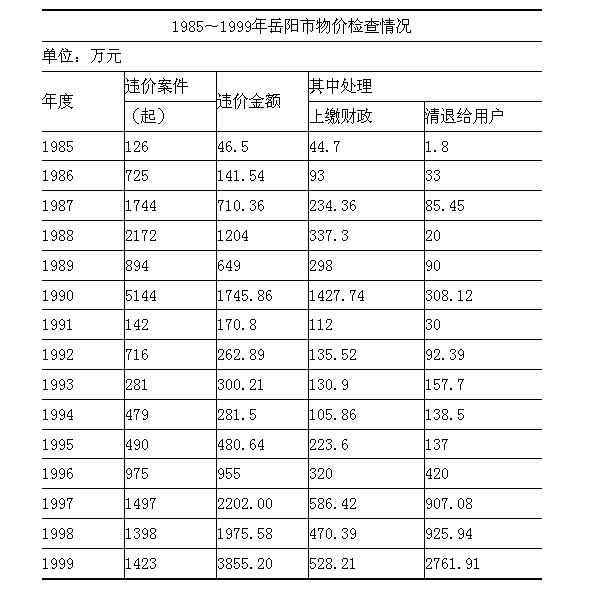1985~1999年,各级物价检查所参加全国统一组织的一年一度的“税收、财务、物价”大检查,重点检查农产品购销、农业生产资料销售、交通运输、水电价格和教育、邮政电信、医疗卫生及行政专项收费等执行情况,累计查处违价违纪案件18206起,违价金额14981.08万元,上缴财政5048万元,清退给用户6108.95万元。其中1997年查处行政事业单位乱收费案件219起,违纪金额310.7万元,1998年查处市地税系统乱收费案件36起,违规金额166.8万元。1999年查处行政事业单位乱收费案件29起,违法金额990.79万元,其中市医疗系统21起,金额583.16万元;市教育系统4起,金额343.25万元;公安系统4 起,金额64.38万元,案件分别占1997年、1998年、1999年总数的14.7%、2.6%和2%,金额分别占违价总数的14.1%、8.4%和 25.7%。