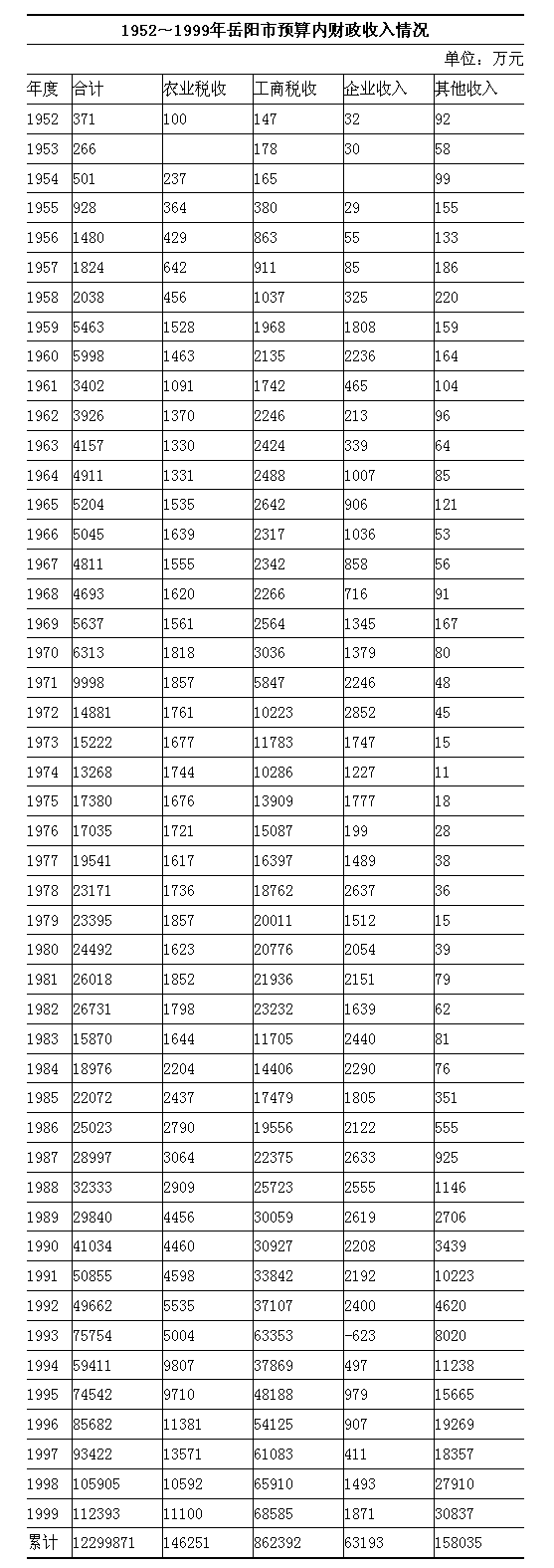 1952~1999年,其他收入总额158035万元。1999年收入30837万元。