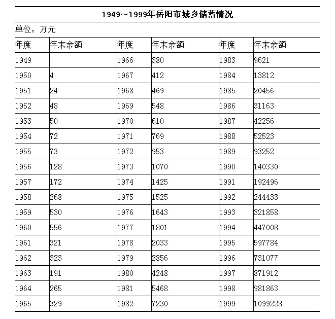 1949年9月,人行岳阳、临湘、平江、湘阴、华容等县支行相继开办折实储蓄存款。储户存入人民币,银行按当日折实牌价折为“标准实物单位”存储,支取时再按同日牌价将折实单位换算成人民币付给储户。1950年,储蓄种类扩为活期、整存整取、零存整取、整存零取、存本取息5种,利率均由银行定时挂牌公布。各银行相继开办保本保值定期储蓄,期限为半个月、1~3个月和1年,并对存户姓名、存款金额严格保守秘密。10月,停办折实储蓄。11月,人行岳阳县支行成立储蓄股,为境内第一个专门管理和办理储蓄业务的机构。同年,境内邮政储蓄恢复。1951年,银行广泛开展劝储揽储活动。1952年开办定期定额储蓄,停办保本保值储蓄。1953年,人行在农村开办“优待售粮定期定额储蓄”,采取记名方式,利息从优。同年,邮政储蓄业务停办。1954年9月,银行首开零存整取有奖储蓄。11月,人行湘潭专署中心支行批准岳阳县支行成立南正街储蓄所,为境内第一家独立挂牌营业的储蓄所。1955年1月,实行人行总行新颁发的《储蓄章程》,规定在集镇只办活期、整存整取和定期3种储蓄,在农村营业所只办定期定额储蓄,活期储蓄由信用社办理。1956年,信用社以农业社为单位,聘请代理业务员,按生产队成立信用小组,信用社储蓄存款有所发展。1957年9月,银行修订《零存整取有奖储蓄章程》,停办1年期,开办半年期,每户每月储金起存额由2元改为4元。是年,各县人行城镇储蓄余额由1950年的4万元升至172万元。
