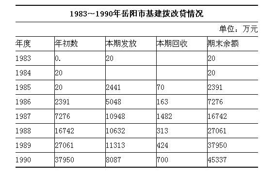 1981年,基本建设投资试行拨改贷,对行政和无盈利单位以及国家和地方财政指定的一些特别项目,仍实行财政拨款办法。是年,核定岳化贷款指标为622万元,该厂设计人员、财务人员、预算人员和银行配合共核减预算价值20.74万元,决算价值135.7万元,还贷款472.4万元(计划回贷200万元)。1985年,境内由国家预算安排的基本建设投资全部实行拨改贷,行政单位和无偿还能力的事业单位则先予贷款,归还确有困难者再豁免。1986年有部分财政拨款。1983~1990年,市建行共发放拨改贷48489万元,此后未再增发此类贷款,只协助财政部对中央拨改贷资金转为国家资本金签署审查意见。