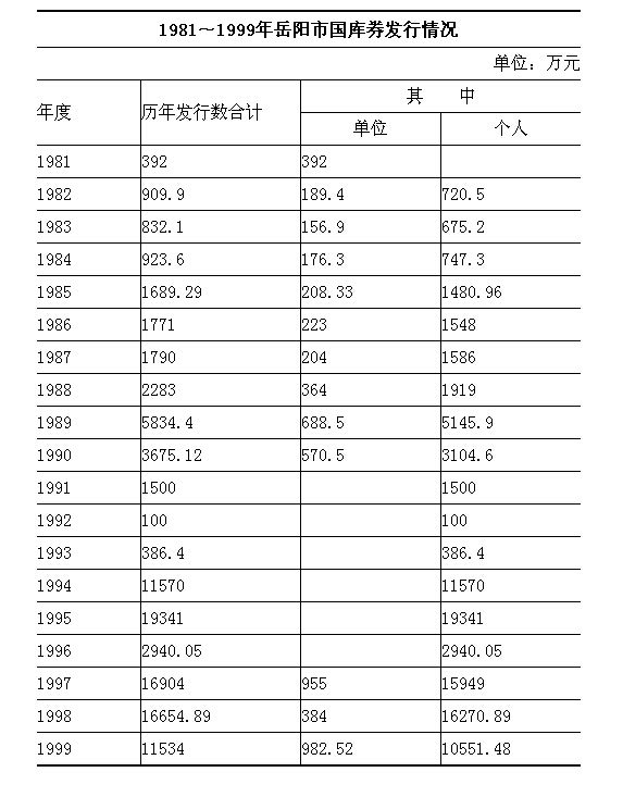 1981年,国家开始发行国库券,地区人行及其所属机构代理财政部门办理国库券的发行和还本付息事宜,是年,国库券只对单位发行。为了防止国库券遭受损失,在10元、1万元和10万元3种面额加印“本券偿还时,不兑付现金,只准转账”字样。1982年后,每年发行的国库券,单位和个人均可认购,其还本付息事宜,除地区人行及其所属机构办理外,还委托地区农行及地区中行所属机构代办。属于单位购买的国库券,发给收款单,个人购买的发给国库券。1984年,国库券发行和日常业务由市工行代理。1985年,由于机构改革,国库券的发行和还本付息工作改由市人行委托专业银行及其基层处、所办理。1985年,个人购买1000元以上的发给国库券收款单。1986年始,在继续发行国库券同时,办理中签国库券的兑付工作,兑付期为每年7月1日~