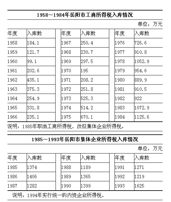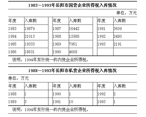 1983年6月,对国营企业进行利改税第一步改革,除军工、邮电、粮食、外贸、农牧、劳改、煤炭以及各级农机公司、种子公司外,其余由上交利润改征国营企业利改税。国营企业所得税一般以独立核算企业为纳税单位;联合经营企业以分得利润的各方为纳税单位。大、中型企业按55%比例税率征收,饮食服务、营业性宾馆、饭店、招待所等按15%的税率征收,小型企业、县以下供销社按8级超额累进税率(7~55%)征收。1984年10月进行利改税第二步改革,缴纳所得税的国营大、中型企业由400余户增至500余户。大、中型企业税率55%,饮食服务、宾馆、饭店、招待所改按小型企业新8级超额累进税率(10~55%)征收。小型企业放宽标准:工业固定资产由150万元放宽到300万元,年利润由20万元放宽到30万元;商业取消职工人数30人的标准,只按年利润划分,原城区企业年利润5万元、县(市)企业3万元,一律改为年利润不超过8万元。商办农牧企业不论利润多少,均视为小型企业。小型企业税后利润不论多少,全部留给企业,不收承包费,也不减征所得税,发生亏损,财政也不补贴。小型企业一经划定,7年内利润、固定资产不论增加多少,均不升大、中型企业。1985年,集体工业(包括手工业合作工厂、社)、商业(包括供销社、合作商店)、建筑安装、交通运输(包括搬运装卸)、街道企业、乡镇企业及其他集体企业,以及按规定向所属企业提取管理费的各级管理机构,均缴纳集体企业所得税。同时,取消工商所得税。税率自10~55%,分8级超额累进。同年,平江县经省政府批准为贫困县,乡镇企业免征所得税3年。1987年,国营企业推行经营承包责任制,其应纳国营企业所得税的规定不变,只按企业实现利润较承包指标长短部分,由财政另行结算退补。1988年10月,凡资产属私人所有,雇工8人以上(含8人),并经当地工商部门批准发照经营的企业,定为私人企业,生产经营所得依35%的税率征收私营企业所得税。1989年12月,这类企业只有74户。同年9月,市税务局在汨罗市30户国营企业中进行“利税分流”试点,其国营企业所得税不分大、中型企业,均按固定税率35%征收,财政实行税后利润承包,企业实现利润与财政核定承包数的差额用于归还贷款,免征国营企业所得税。