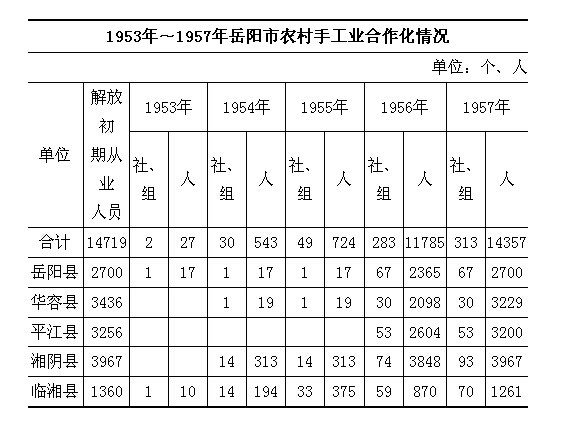 境内手工业历来比较发达,主要有铁、木篾、泥、制革、砖瓦、缝纫、毛笔、鞭炮、刺绣、织染、制线、制鞋、油漆、造纸、制伞、食品等数十个行业。中华人民共和国成立初期,手工业专业人员有1.47万多人,均在农村或集镇分散经营。湘阴县54户篾匠,于1950年每人集大米50公斤,自动组织联合社,集体经营,系境内最早的手工业合作组织。1953年,各地根据中共中央提出的过渡时期总路线,采取“培养典型,以点带面”的方法,引导手工业人员走集体化道路。农村手工业人员加入农业合作社,从事工副业生产;居住城镇的,在集镇成立工厂或合作社(组)。1955年冬,农业合作化运动迅猛发展,“积极领导,逐步改造,稳步前进”的方针受到冲击,手工业改造步伐随之加快。至1956年基本完成对手工业的改造。1957年,对一些规模过大的手工业合作社进行适当调整。 1958年全部并入人民公社。