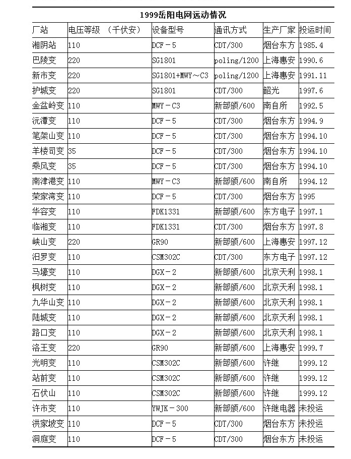 电网自动化 1980年,岳阳电厂及境内11座110千伏变电站先后安装使用远动装置,其遥测项目有:有功功率、无功功率、电流、电压等,可接受遥测量309个、遥信量354个。 1985年,“701”投运1套DC-4型电力系统远动终端装置。1990年,网内12套远动装置全部接入该终端微机处理系统