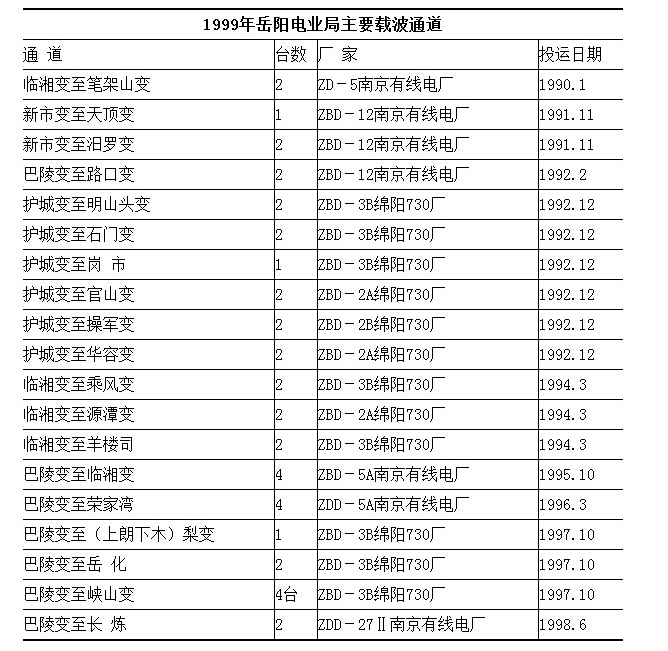 载波通讯 1959年,网内第一对载波机在岳阳电厂至桃矿变电站安装使用,型号为71~A型简易载波机。随着电网的扩大,载波通讯逐年发展,至1999年,网内建成主要载波通道19条,装设载波机41台。