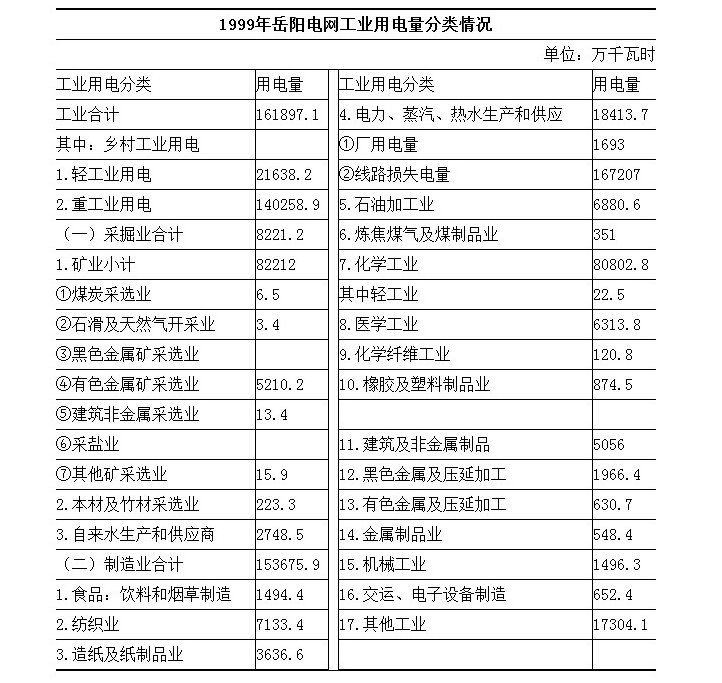 造纸工业用电 1963年,岳阳县纸厂投产,当年用电量125.7万千瓦小时。1968年,城陵矶造纸厂投产,造纸工业用电量达500万千瓦小时,占工业用电量的8%。此后,湘阴纸板厂、人民造纸厂、华容县造纸厂、岳阳县鹿角造纸厂相继投产。1990年,造纸及纸制品业用电量8056万千瓦小时,占工业用电量的6.69%。1990年后,县(市)造纸厂相继破产倒闭,或资产重组、转产、停产,造纸行业用电量减少,1999年为3636.6万千瓦小时,占当年工业用电量的2.25%。