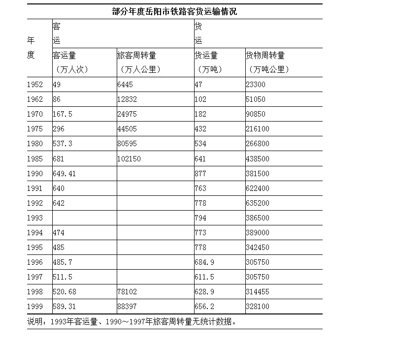 60年代,城市人口增多,经铁路客流量增加。 1970年京广复线通车,通过岳阳客车增至10对。1971年增加岳阳至城陵矶交通车6对。1980年,通过岳阳车站客车增至14对。1987年4月,增开岳阳至广州的始发管内快车315次及长沙至岳阳的终到管内快车314次。1999年,岳阳站过境到发客车68列,其中始发、终到各6列。