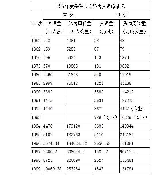 50年代,交通部门实行统一组织货源,统一运价,统一调配(时称“三统”政策)。汽车运输企业几乎垄断货运市场。1953年,试行货车拖挂,运输效率有所提高。1957年后,各县先后开办汽车货运业务,每个县货运汽车1~3辆,货物运输量仍不大。1962年,共有货运汽车25辆,完成货运量67万吨,货物周转量79万吨公里。1963年,各县汽车站建立支农服务队或支农服务小组,货运以农用物资或农副产品为主,支农货运非常繁忙,年度货运计划顺利完成。1965年,湘运34客货车队和15客货车队分驻岳阳和平江,共有货车87辆、338吨位。全社会完成货运量79万吨、货物周转量95万吨公里,其中社会集团完成货运量3.l万吨、货物周转量14.8 万吨公里。