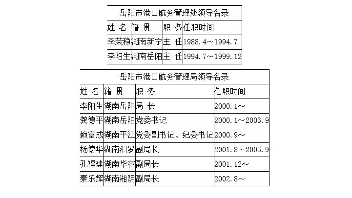 民国21年7月,交通部长江航政局长沙办事处在岳阳设立航政登记所,年底撤销。34年12月,在城陵矶设船舶办事处。中华人民共和国成立初期,湖南省交通厅内河航运管理局在城陵矶设立中心管理站。 1953年11月,与岳阳轮船运输站、岳阳民船联运支社合并,成立湖南省交通厅内河航运管理局岳阳管理站。1956年6月,撤销岳阳管理站,成立湘航岳阳办事处。1964年,湘航岳阳办事处并入岳阳港务局。1965年12月,成立城陵矶港务局。1988年4月,与岳阳市航道管理处、岳阳市港务管理处合并,成立岳阳市港口航务管理处,为副处级事业单位,隶属市交委。内设办公室、人教科、计财科、港口科、航道科、运务科、港航监督科、船舶检验科,同年9月,增设水运调度管理办公室、港口规划办公室。1999年,更名为岳阳港口航务管理局,升格为正处级。