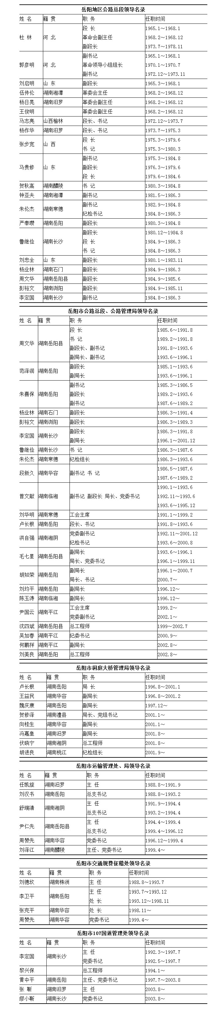 岳阳市公路管理局 1965年 1月,岳阳公路养护总段成立。1966年“文化大革命”开始,公路养护总段处于瘫痪。1968年1月,岳阳公路总段革委会成立。是年12月,与岳阳汽车中心站合并,成立岳阳地区公路运输服务站,下设路建组管理养护工作。1970年初,恢复公路养护总段;7月,与地区交通邮政局合并,下设交通建设组。 1971年1月,公路养护归属地区交通局。1972年11月,恢复地区公路养护总段,隶属省工程管理局与地区革委会双重领导。1981年,总段收归省管理,更名为岳阳地区公路总段。1985年1月,地市分开,成立岳阳市公路总段,管辖岳阳县公路段、岳阳市市区公路段、岳阳北门汽车渡口所。其他所属单位均属岳阳地区公路总段管辖。1986年3月,地区公路总段并入市公路总段。1992年12月,更名为岳阳市公路管理局(以下简称公路局)。1999年,市公路局内设办公室、综合管理科、政工科、财务审计科、公路公安科、公路规费办、项目办等15个科室。下设107国道管理处、市路桥工程处(加挂公路桥梁基建总公司牌子)、市北门战备渡口管理所、市物资供应站、市公路职业学校、市公路工程质量监督管理站、岳兴公路管理所、通海公路管理所、岳华公路管理所、湘长公路管理所、新湘公路管理所、市区公路局及岳阳、平江、汨罗、华容、湘阴、临湘等县(市)公路管理局。