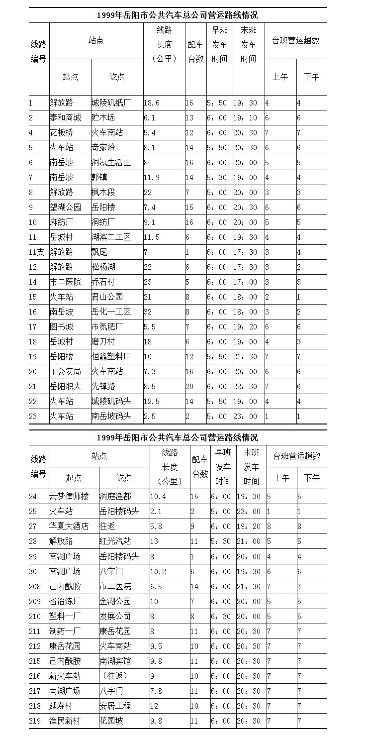 1952年,211工厂有货运汽车2辆、吉普车 1辆在城区运行。1959年6月,岳阳县在荣家湾设立汽车站。次年,搬迁至县城东茅岭,营运线路有岳阳至公田、城区至城陵矶2条。1965年7月,由岳阳县汽车站无偿下拨客车3辆、货车2辆,司乘人员15人,组成岳阳县城关镇公共汽车站,营运线路为火车站至北门渡口、竹荫街至城陵矶。这是岳阳城区公共汽车的开始。1970年,营运汽车9辆,线路3条,线路长度53公里,年产值7.92万元。1977年12月,岳阳市人民汽车公司(以下简称人汽公司)有车辆 9辆,营运线路7条,线路长度81公里,年客运量446万人次,产值76.2万元。中共十一届三中全会后,市人汽公司组建出租车队。1984年12月,分体创建岳阳市第二公共汽车公司。1990年,市人汽公司有营运车辆88辆,线路14条,线路总长189公里,年行驶里程477万公里,客运总量3051万人次,年产值630多万元,固定资产总值657万元。1996年5月,岳阳市公共汽车总公司自筹资金添置14辆无人售票大客车,开通南湖至岳阳楼9路无人售票公交线,打破岳阳市公交行业长期实行有人售票的传统经营模式。1999年底,市公共汽车总公司有营运车辆590台,营运线路38条,线路总长 417.8公里,年行驶里程4000万公里,客运总量6700万人,年产值4757万元,固定资产总值达1.01亿万元。