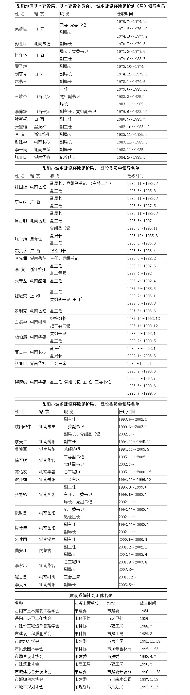 岳阳市建筑工程管理局 1979 年1月,从城建局划出,成立岳阳市(县级)建筑工程局。1984年3月改名为岳阳市建筑工程公司(副处级企业),同年8月更名为岳阳市建筑总公司(副处级事业单位)。1985年8月,更名为岳阳市建筑工程管理处。1994年1月更名为岳阳市建筑工程管理局。内设办公室、工程科、企业管理科、施工监察科、计财科、政工科。下设二级事业机构有市建设工程质量监督站、建设工程定额管理站、建筑行业劳保基金统筹办公室和建设工程质量检测所(建筑工程科研所),均为正科级事业机构。1999年4月撤销施工监察科,成立城市管理监察大队建筑工程监察大队,同时将市建设工程质量检测所更名为建设工程质量检测中心,与建设工程质量监督站合署办公,两块牌子,一套人员,并撤销建筑工程科研所。直属企业有市一、二、三、四建筑工程公司、机械化建筑工程公司和工程建设监理公司。 1999年,共有干部197人、工人623人。