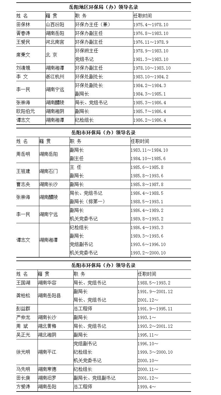 1977年3月,成立平江县革委会环境保护领导小组办公室,配干部1人。次年10月,成立岳阳市革委会环境保护办公室。1979年5~12月,湘阴、汨罗、临湘、华容、岳阳4县分别成立环境保护办公室。1981年7月,平江县革委会环境保护领导小组办公室更名为县环境保护办公室。同年,撤销岳阳县环境保护办公室,并入岳阳市环境保护办公室。1983 年10月,成立岳阳县建设环境保护局,内设环保办。1984年1~6月,华容、临湘、平江、汨罗、湘阴5县环保办与城建局合并,成立城乡建设环保局,汨罗县城乡建设环保局内设环保办,其余4县城乡建设环保局内设环保股。同年6~10月,市南区、北区、郊区相继成立城建环保局,内设环保办(股)。1985 年,岳阳、华容、临湘、汨罗4县环保办与城建局分设,1986年10月,平江县环保办分设。1987年4月,湘阴县环保办分设。1988年,南区成立城乡建设委员会,内设环保办。1990年,汨罗市、临湘市、南区、北区、郊区环保办改为环保局。至1995年,各县(市)环保办均更名为环保局。1996年4 月,成立岳阳楼区、云溪环保局和岳阳市经济技术开发区环保办。1998年1月,成立君山区、南湖旅游度假区环保办。