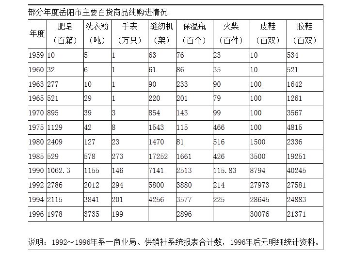 1949年底~1952年,百货商品仍以私商经营为主,进货沿袭过去渠道,自由选购。国营百货商业企业经营的商品,由上级公司分配,指定地点调入。1951年,湖南省合作事业管理局确定牙膏、手电筒、雨伞、瓷器、力士鞋、套鞋、火柴、肥皂纳入计划商品。中国百货公司岳阳支公司根据省百货公司的安排,从长沙、衡阳、津市、益阳、常德、邵阳、汉口、上海、广州、南宁等地共调入商品144.2万元,其中长沙、汉口、上海3市在进货总额中占比重分别为65.2%、20.2%和10.2%。