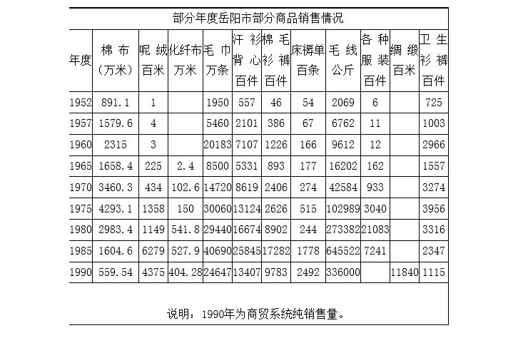 80年代,随着化纤布和棉化混纺布的增加,纯棉布及棉织品销售下降,1983年比1976年下降68%。1984年,取消棉布定量供应,同时放开经营,纺织品批发企业从分配型向开放型转变,一时难以适应,批发业务滑坡,经济效益低下。1988~1990年,岳阳市纺织品公司的批发销售额分别为3505万元、2815万元和2179万元。个体、私营商业经营纺织品从工厂直购部分相应增加。至1996年,岳阳市纺织品公司退出纺织品经营,批发、零售业务完全停止,各县纺织品公司推行承包、租赁经营,个体、私营商业自由购销,境内无辐射能力较强的纺织品批发市场及批发商。