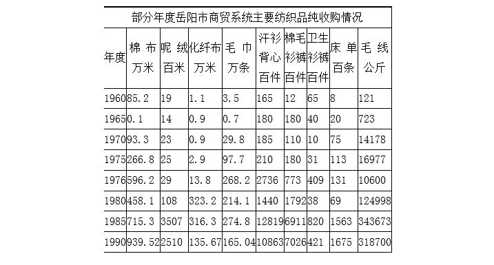中华人民共和国成立后,各县贸易公司、百货公司均兼营纺织品。1953~1955年,设立花纱布公司(1956年改称纺织品公司)。此后各县纺织品公司批发企业自外埠进货,分为上级公司调拨和计划外采购两种方式。同时,供销社系统由供销经理部采购市外少量商品。1950~1984年,各县货源大部分由长沙纺织品站供应。为减少商品的迂回运输,岳阳、华容、临湘3县城乡所需商品,由湖南省纺织品公司划拨指标,从武汉纺织品站(中南批发站)调入。1954年,国家对棉花、棉布实行统购统销、计划分配调拨后,商业系统计划外采购基本停顿,进货比重很小。1971年为4.7%,1972年为0.3%,1979年为2%。