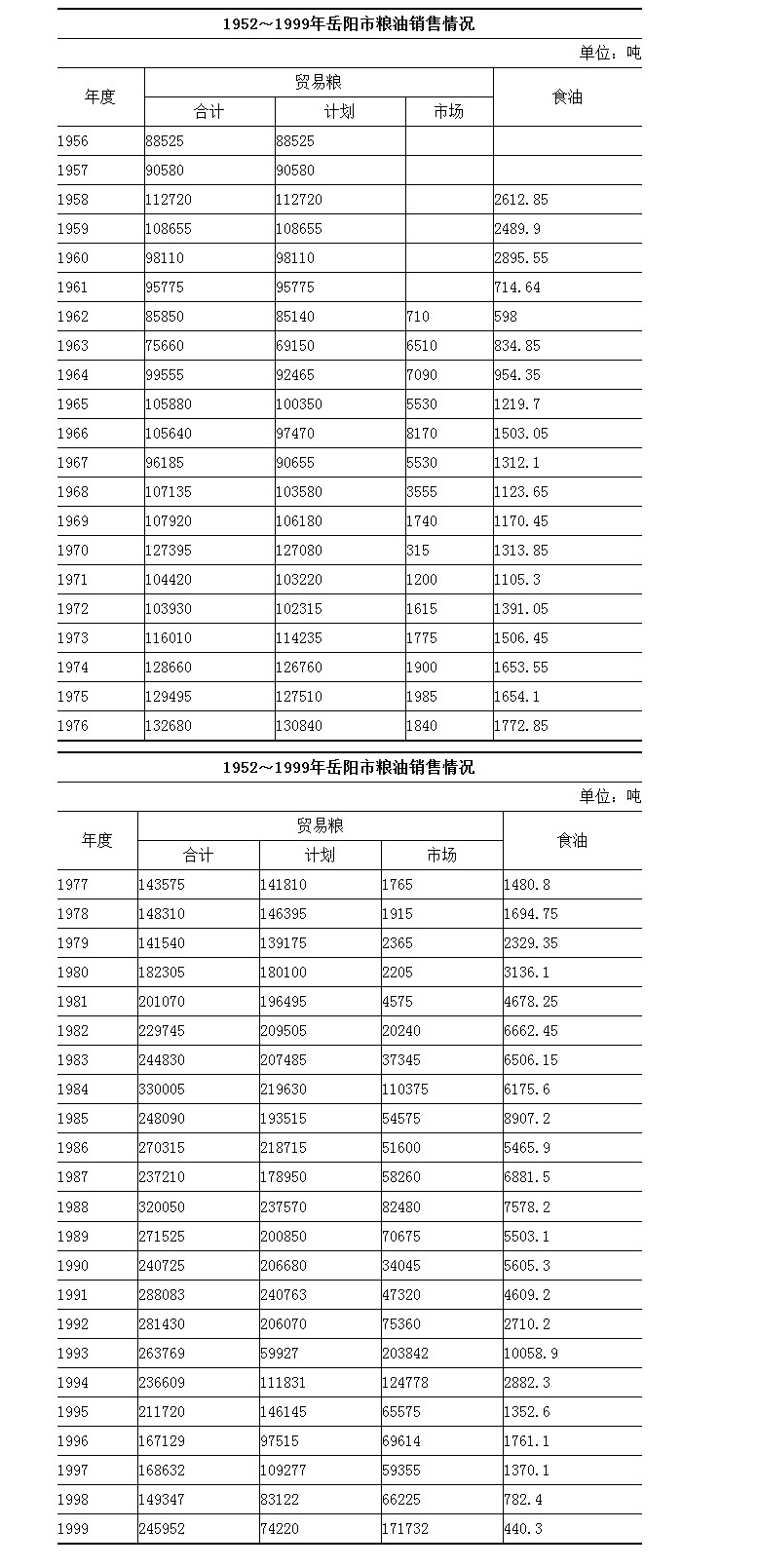 议销 1952年,各县粮食公司根据“以收助销”的原则,组织粮食议销。1~6月,岳阳、湘阴、平江、临湘4县议销大米18585吨。1953年11月粮食实行统购统销后,议销停止。 1962年,粮食部门为平抑粮价,调剂余缺,恢复议购议销业务,议销粮食710吨(贸易粮,下同)、食油3.15吨。1963年,按国家规定,议价收购的粮油,在保证完成国家议价收购计划和上调计划的前提下,就地议购,就地供应。议销粮食6510吨、食油179.7吨。1966年4月,农村粮油市场陆续开放。为支援春耕生产,岳阳地区分配各县议销粮2500吨。1969~1977年,岳阳地区食油议销821.6吨。1981年因自然灾害影响,社员口粮水平下降,4~7月,议销粮食1.25万吨。1983年3月30日后,凡是议购进来的粮油品种都可以议销。花生果、芝麻取消平价和计划内议销价格,全部按议价销售,绿豆部分按议价销售。