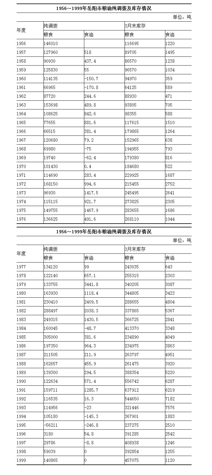 1950年后,境内年年有粮食调出。 1956~1999年,纯调出贸易粮5552834吨,其中,80年代增加议价经营项目。粮食调出尤多,年均34万多吨。90年代,外销粮食受阻,调出量有所减少,年均约14万吨,省内主要调往长沙、邵阳、娄底、怀化、湘西土家族苗族自治州,省外主要调往北京、西藏、陕西、新疆、内蒙古、广东、广西、甘肃等省、市、自治区。调出品种以稻谷、大米为主。为满足粮食市场、面粉业和饲料工业发展的需要,岳阳每年亦须从外地调入大量玉米、小麦等品种。 1980~1999年,年均调入约10万吨。在粮食调拨中,1982~1999年,出口153880吨,进口298041吨,1991年后没有进口粮食。