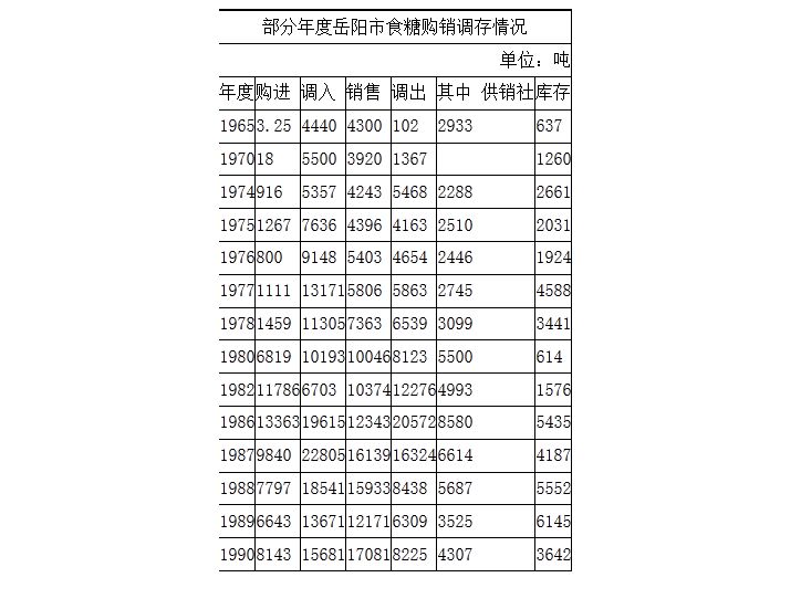 清末民国时期,食糖主要从外地购进。清光绪三十年(1904),岳州关税务司韩威礼在《通商各关华洋贸易略论》中载:光绪二十九年和三十年,岳州海关进口土糖9300担,洋糖1.1333万担。民国 23年8月《湖南之海关贸易》载:17~20年,岳阳进口白沙糖4.0556万担,年均1.0139万担,最高年达1.5万余担,白沙糖货源多来自日本、英国、美国。购进红沙糖9.9432万担,货源来自天津、上海、汉口等城市。