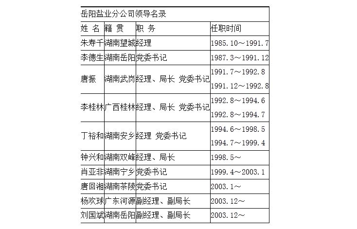 历代政府从中央到地方都设有盐业专门管理机构。清道光以后,岳州设转运局兼督销分局,各县均设督销分局。光绪年间,湖南改督销局为湘岸榷运局,各县设榷运分局。民国20年,湘岸榷运局在岳州设食盐检查所,城陵矶设复查所。次年,湘岸榷运局归并稽核处,由稽核处兼理业务。24年,改稽核处为湘岸盐务办事处,岳阳设立盐务分处。38年,湖北盐务办事处迁往长沙,湖南、湖北两省盐业机构合并,改称湘鄂盐务办事处。岳阳分处因被当地驻军占据离岳抵长,有员工41人,后调减至14人。