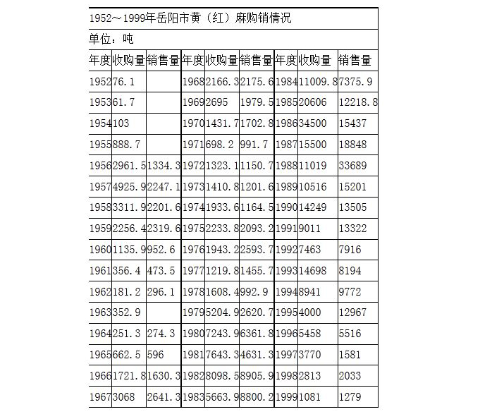 1955年,黄麻被列为国家统一收购商品,供销社2次调整黄麻收购价格,并预付麻农10~15%的无息定金。当年,境内植麻38870亩,产麻1406.4吨,收购888.7吨。1961年,对黄麻停止预购,实行奖售收购,农民每交售50公斤黄麻,供销社奖给化肥(指标,下同)10公斤、原粮4公斤、煤油4公斤、布票3.33公尺。次年10月,湖南省供销社将华容、湘阴、岳阳、平江等县列为省管市场,将标准黄麻收购价由每50公斤37.8元调至40元。1963年,对黄麻实行派购,预付定金,继续实行奖售。1966年,岳阳黄麻纺织厂建成投产,为境内黄麻提供了较大的销售市场,供销社收购黄麻1721.8吨。