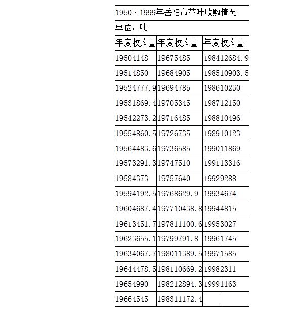 1955年,国家对茶叶实行计划收购,境内由国营茶叶公司、供销社与茶叶生产单位签订派购合同进行收购,由省茶叶公司统一经营,茶叶收购价格由省统一制定。1957年,茶叶改由供销社经营,按计划调拨,并规定收购外销红茶、绿茶和内销绿茶,奖售粮食指标。1958年再度提高收购价格。1960年,扩大奖售范围,开始对收购边销茶、粗老茶奖售粮食。全市收购茶叶4687.4吨。1961年,由于灾害影响,茶叶生产滑坡,收购量减少。收购茶叶的奖售物资,增加化肥、煤油、棉布。1962年实行分等计奖, 并按收购金额给予茶农价外补贴。1963年,将按收购数量(每50公斤)计算奖售的办法,改为按收购金额(100元)计算奖售。奖售的商品有粮食、化肥、棉布、香烟。1964年,将定20%的价外补贴改为正式价格。1973年,改为按收购数量计算奖售,只分级内和级外2个计算奖售的标准,奖售的商品有粮食、化肥,茶叶收价略有提高,当年全市供销社系统收购茶叶6585吨。此后,茶叶产量和收购量逐步提高。1982年收购茶叶12894.3吨。