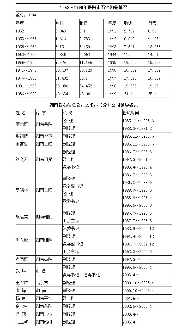 1992年,石油事业蓬勃发展,出现多种经济成分并存局面。岳阳石油调入购进除主渠道石油公司外,行政、企事业单位及个体、私营业主也从事部分调入购进,油源扩大到全国各地。1991~1999年,共调入购进石油122.427万吨。