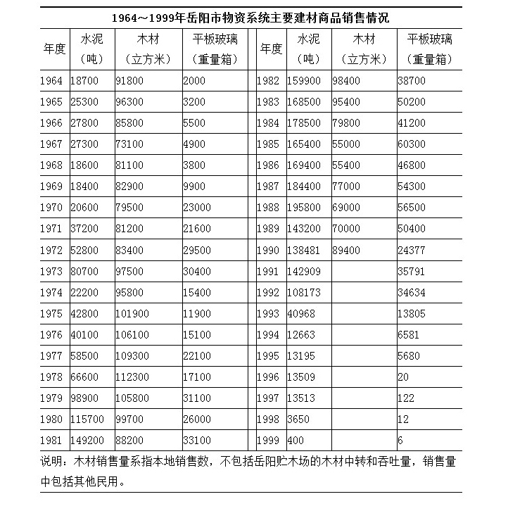 建筑材料系大宗笨重物资,主要实行“指标到局,实物到厂(工地)”,由物资部门归口经营,其中木材由林业局所属森工部门、木材公司经营。70年代以前,水泥的计划调拨量占90%,80年代降至60%,1990年水泥价格并轨后,计划分配部分实行定量不定价,转向市场调剂。1983年始,木材纳入国家统一分配,归口森林工业部门统购统销,1985年取消统购统销,改为市场调剂,全市木材经营单位增至150多家,无经营许可证而经营木材的300多家。平板玻璃属计划安排的紧俏商品,1964年以前由湘潭专署财委和物资局安排指标,1963年拨供平江、湘阴、岳阳县472.24吨,为销售较多的年份。1964年后,岳阳专署物资局为主安排供应,70年代后逐步放开,品种规格增加,1985年后市场放开,成为多家经营、竞销的商品。1990年,全省物资系统开展“上台阶”劳动竞赛,物资企业销,水泥和平板玻璃销售量大幅增长。随着装饰业的兴起,装饰材料供应也有所增加,主要是采取市场调节方式供应。1994年后,物资企业的建筑材料销售量逐年减少,至1998年,停止经营,由民营物资企业取代。