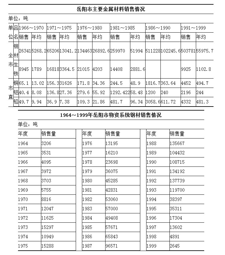 中华人民共和国成立后,金属材料主要实行计划供应,按照省计委确定的“统筹兼顾、全面安排、保证重点、照顾一般”原则,由各级政府计委按年分配指标,物资部门负责调拨供应,逐级下达,定点供货。“文化大革命”期间,分配体制未变,但供货数量不够稳定,1971年后,三线建设增加,金属材料供应量增加很快。1966~1970年年均销售钢材5268.2 吨;1971年~1975年均13041.2吨;1976~1980年年均26892.6吨;1981~1985年年均51994吨;1986~1990 年年均102245.6吨,比1966~1970年年均销售增加18.41倍。1979年,组织生产建设单位参加金属材料调度网,在供求关系不变的情况下,打破地区、行业界限,进行品种调剂,试行指标储蓄。物资部门在机械、纺织、化工、市轻工行业选择21家生产企业试行金属材料按需核实供应,对洞纺、市化肥厂、市电机厂、轻工机械厂、铁山水库等生产单位实行配套供应。1983年,供应洞纺钢材4580吨,超供580吨;铸铁管1593吨,超供1111 吨。1987年,投资18.5亿元的华能岳阳电厂筹建,市物资局派员驻厂组成物资部,配套承包供应,送货到工地,3年时间供应钢材7.8万吨。