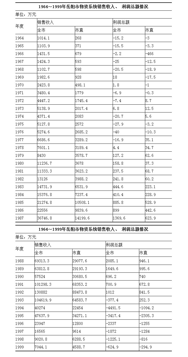 第一个五年计划期间,工业和城市建设迅猛发展,1958年“大跃进”开始后,大办工业,大炼钢铁,物资需求急剧增加,由商业部门兼营工业生产资料的格局难以适应形势和要求。1959年2月后,各县物资管理局(以下简称物资局)相继成立,担负起工业生产资料调拨、供应的任务,物资部门成为工业生产资料流通的惟一渠道。50~60年代,农村大办小水电,湖区大办电排工程,建安全楼,物资部门以打“歼灭战”的形式提供物资保障。60年代中期后,中央和省有关部门相继投资在岳阳兴建一批大、中型企业,岳阳地区及各县亦新建了一大批中、小型企业,物资部门全力以赴,保障工程顺利进行,物资供应系统的销售额有较大幅度的增长,1976年销售收入5264.6 万元,为1964年的5.2倍。由于受计划经济模式的束缚,主要物资的分配和供应都纳入直接计划,物资部门不准进行工商登记,不按经济规律办事,不讲经济核算,造成长期亏损。1964~1977年,物资系统共亏损209.4万元。