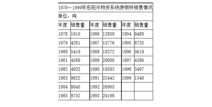 1980年以后,个体户及外地钢厂抬价收购,市场出现混乱。1987年,国家取消上交废钢铁的指令性计划,开放废钢铁市场,市金属回收公司与华能岳阳电厂、巴陵石化公司等重点企业签订废钢铁收购协议, 稳定收购渠道。供销社系统收购废钢铁仍继续进行,1952~1985年共收购70863吨。1986年后,市场开放,废旧金属收购变为多家经营的商品,物资部门仍然占规模优势,1989~1993年年均收购和销售在2万吨以上。1994~1999年,收购和销售均逐年下降,年均仅500多吨。