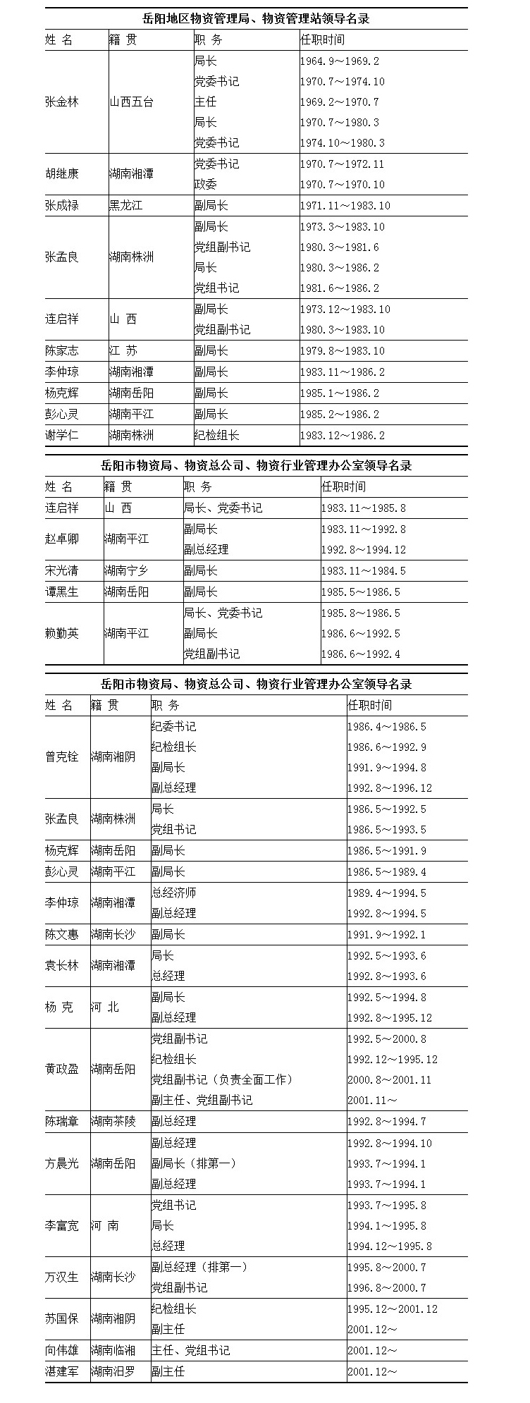 1964年10月,成立岳阳专署物资局,撤销岳阳县物资局,岳阳县物资由专署物资局代供。“文化大革命”开始后,岳阳专署物资局自然消失。1969年,地区物资局改名物资管理站,1970年7月,设立地区革委会物资局。1979年3月,更名为地区物资局。1983年9月,岳阳市物资局成立,下辖岳阳县、南、北、郊区物资局,并成立直属的金属、轻化建材、机电设备、生产服务、燃料、金属回收等公司和物资协作、服务中心。地区物资局更名为物资管理站,各县物资局改为物资站或物资总公司。1984年7月, 地县物资站又恢复为物资局。地区物资局直属机构有金属公司、机电公司、轻化建材公司、生产服务公司和城陵矶综合仓库。