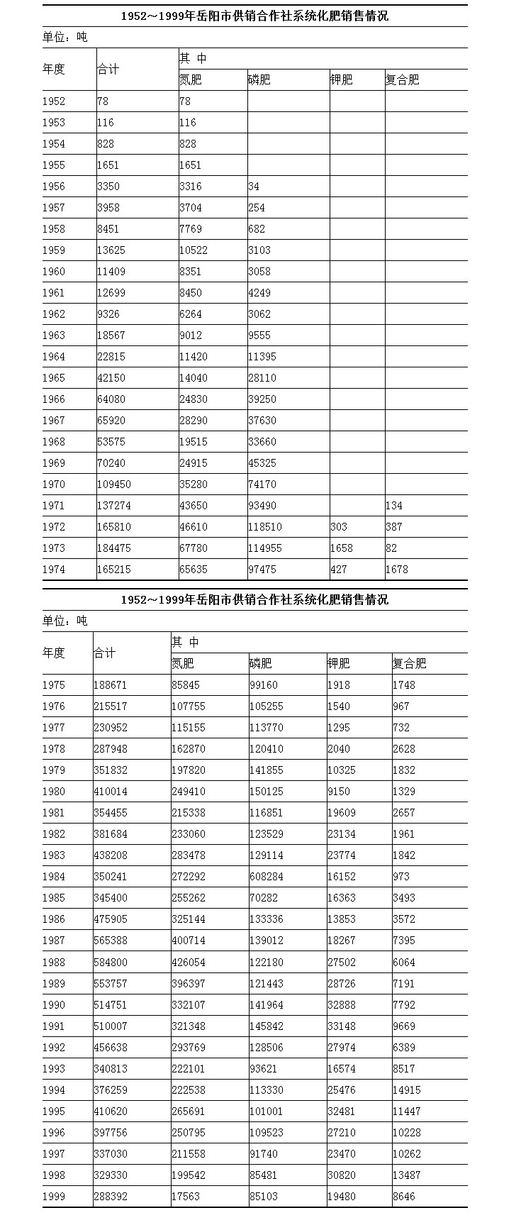1952 年,境内供销社系统开始经营进口化肥硫酸亚,平江、岳阳2县供销社共销售硫酸亚78吨,由于部分农户施用不当,造成禾苗青风倒伏而减产。赊销给农户的化肥贷款,有的无法收回。1953年,临湘、湘阴县继平江、岳阳县后经营化肥。平江县供销社系统干部职工将硫酸亚改装成0.5公斤、1公斤的小包装,分片下乡,宣传动员,并明确表示,增产归队,减产由供销社补偿。同时,讲解使用方法,终获成功。平江县第一区供销社,1952年只销硫酸亚250公斤,1953 年经过典型试验,共销售化肥116吨。1955年,华容县开始经营化肥,至此,硫酸亚在各县普遍推广。1954年,岳阳县开始推销过磷酸钙。1955年, 平江县率先推广尿素。1956年,临湘县羊楼司供销社在尖山农业社的小麦地里,对尿素、硫酸亚、人畜粪作对比试验。试验结果:0.5公斤尿素可抵1公斤硫酸亚,农民由不买尿素到争购尿素。1964年开始推广碳酸氢铵,1972年推广复合肥,1979年推广氨水,80年代推广微量元素肥,90年代推广专用复合肥。经过反复试验推广,化肥的经营品种,由单一的硫酸亚发展到氮、磷、钾三元素齐全,品种达20多个,销售数量也由少到多,逐步增加。供销社系统化肥供应量1960年为11409吨,1970年为109450吨,1980年为410014吨,1990年为514751吨,1999年为288392吨, 氮、磷、钾供应量,按实物单位计算的比例是:1960年氮肥占73.2%,磷肥占26.8%;1970年氮肥占32.2%,磷肥占67.8%;1980年氮肥占60.8%,磷肥占36.6%,钾肥占2.2%,复合肥占0.4%;1990年氮肥占64.5%,磷肥占27.6%,钾肥占6.4%,复合肥占 1.5%;1999年氮肥占60.7%,磷肥占29.5%,钾肥占6.8%,复合肥占3%。