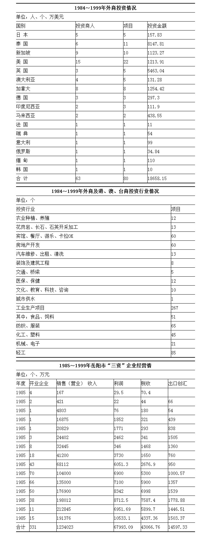 1985~1999 年,岳阳市外资到位41249.84万美元,占合同外资额的71%。累计开业或投产的“三资”企业331家,从业人员9622人,累计完成销售额 1234023万元,完成利润67993.09万元,缴纳税收43066.76万元,产品出口创汇14597.33万美元。