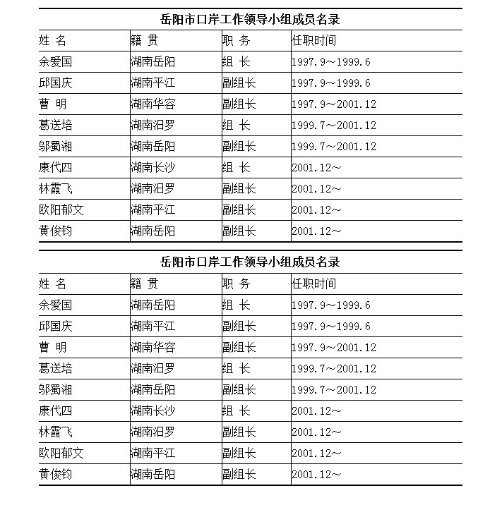 1993年2月,成立岳阳市人民政府口岸管理办公室,为副处级事业单位。1997年7月升格为正处级行政机关。9月,成立岳阳市口岸工作领导小组。
