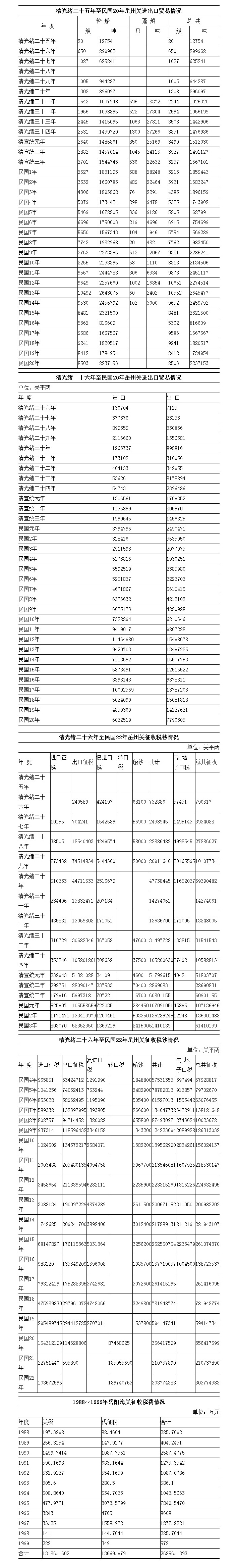 进出口税 进出口货物关税均按其申报进口或出口之日及实施的税则、税率计征。进口货物以海关在审定的正常到岸价格为定税价格,出口货物以海关审定的正常离岸价格扣除出口关税为完税价格。岳阳海关征收的进出口关税最多的年份为1996年,达3834万元。